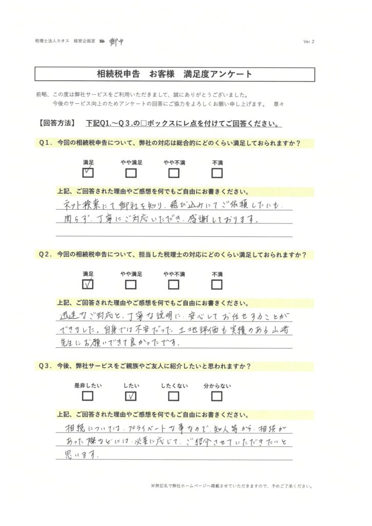 飛び込みにてご依頼したにも関らず、丁寧にご対応いただき、感謝しております。